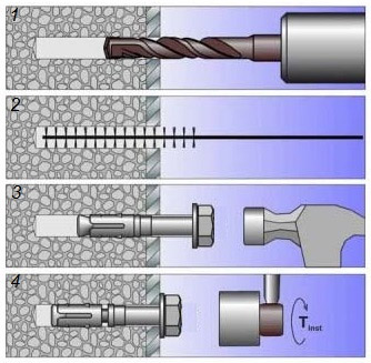 Монтаж анкерных крепежей не вызывает затруднений. Справиться с задачей по силам одному мастеру. Для проведения работ потребуется перфоратор и молоток.
